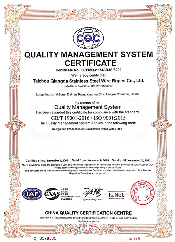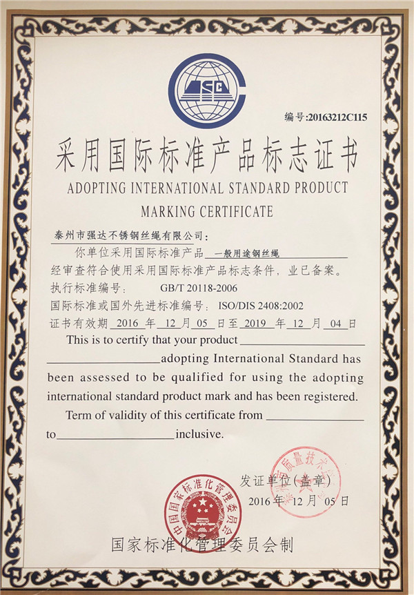 泰州市強達不銹鋼絲繩有限公司位于江蘇興化市戴南經濟開發(fā)區,公司致力于不銹鋼絲繩產品生產,立志成為“國內技術標桿型吊索具生產企業”。以此戰(zhàn)略思想指導,公司堅決貫徹“質量贏市場,管理增效益,誠信贏天下”的質量方針。以完善的服務在國內不銹鋼絲繩市場樹立良好的品牌形象。公司榮獲“江蘇省質量信得過企業。 靈活的管理機制,經驗豐富的